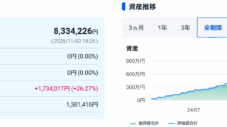 2024年1月からNISAでオルカンに月30万円ずつ積み立てた結果、2025年11月2日時点で、元本6,600,000円に対し、評価額8,334,226円、評価損益は+1,734,017円(+26.27%)となりました。何も考えずに月30万...