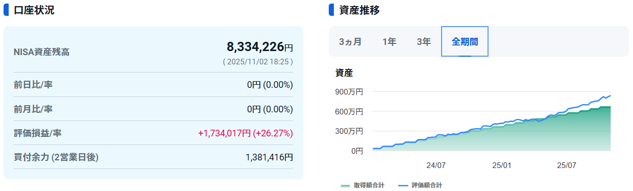 2024年1月からNISAでオルカンに月30万円ずつ積み立てた結果、2025年11月2日時点で、