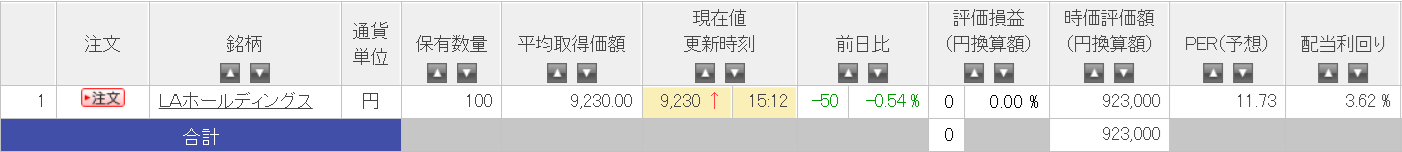 本日2026年1月19日 高市首相が解散発表をした日、LAホールディングス(2986)を終値の9,230円で100株買いました。正式には発表の数時間前ですが。